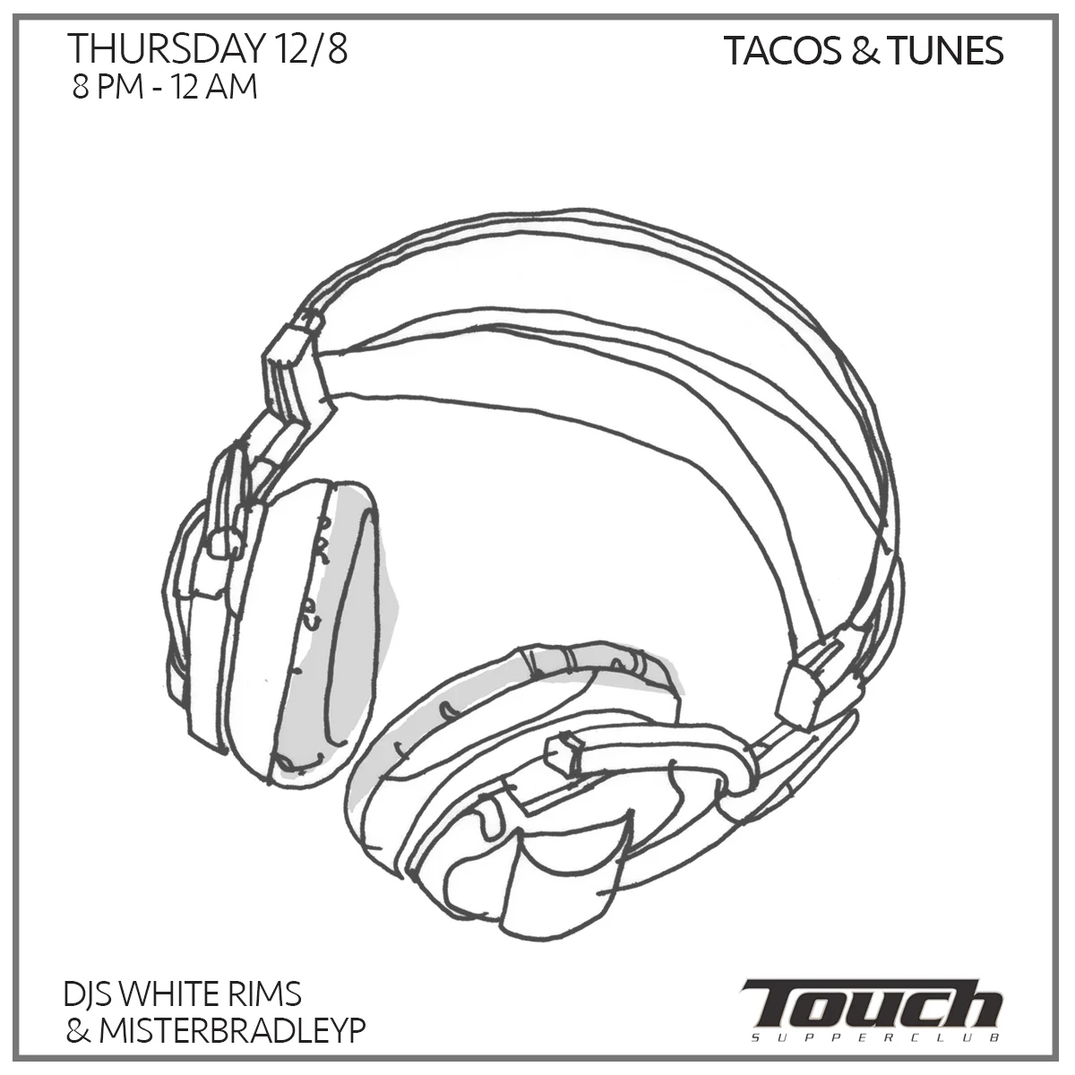 ✚ gCal ✚ iCal Thursday 12/88 PM - 12 AMTacos & TunesWith DJsMisterBradleyp &White Rims(Every Thursday at Touch is Taco Night and the kitchen is open from 5 PM - 1 AM. Join us this week as we add great music to the menu!)